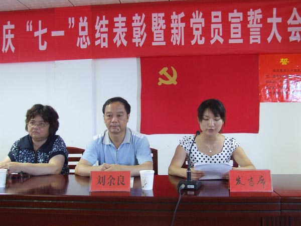 随后,学校副校长刘余良宣读了学校党委《关于表彰先进党支部、优秀共产党员和优秀党务工作者等的决定》的文件,出席大会的领导分别为先进党支部、先进“共产党员示范岗”、优秀共产党员、优秀党务工作者、“共产党员示范班”优秀班主任等获奖集体和个人颁奖。颁奖仪式结束后,举行了新党员宣誓仪式。在李慧中副校长的带领下,章盛、肖丽莎两位同志面对党旗庄严宣誓,表达了为共产主义事业奋斗终生的决心。李慧中副校长对他们寄予殷切的希望,希望他们不断加强党性修养,不断改造主观世界,在本职工作岗位上发挥先锋模范作用,用自己的实际行动争取做一名合格的正式党员。