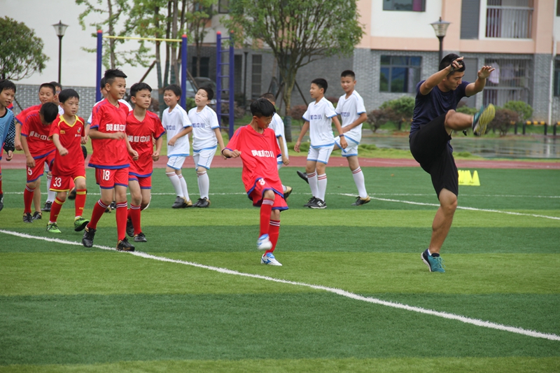 细雨中,绿色的球场上一群洋溢着笑脸穿着红白相间球服的孩子接球、传球,形成了一道靓丽的风景。王潇翔老师还组织学生进行了一场现场比赛,在过程中还对世界杯进行了介绍,赢得了听课老师的高度评价。