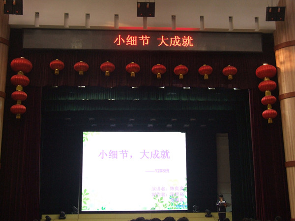 木桶的容量取决于那块最短的木板,铁链的牢固程度取决于其中的每一环。我们的生活就是由无数个细节组成的。为了进一步强化学生的细节意识,培养学生从大处着眼从细节入手的能力,2013年11月18日,我校全体师生在汇美馆举行升旗仪式,仪式上1208班陈爽爽同学发表题为“小细节,大成就”国旗下讲话。