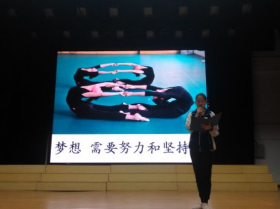 仪式上,蒋青同学通过播放视频:残疾人的舞蹈梦,引起同学们的震撼与深思:梦想的力量到底有多大?如何实现自己的梦想?之后,他与大家分享了自己追梦历程中的坎坷,告诫大家:梦想必须与自身的实际相切合,梦想的实现需要不断地拼搏,不断地战胜自己。同时,蒋青同学列举本班同学对梦想的执着追求过程。有了梦想,调皮捣蛋的学生少了,自觉出入舞蹈房的学生多了,大家变得不再任性、不再脆弱,变得越来越坚强。一双双磨破的舞鞋,一滴滴辛勤的汗水,无不记录着同学们的成长与进步。慢慢地,大家开始把专业训练的累与痛变成了一种习惯、一种幸福。这一切的一切,源自于1204班全体同学对梦想的坚定追求。