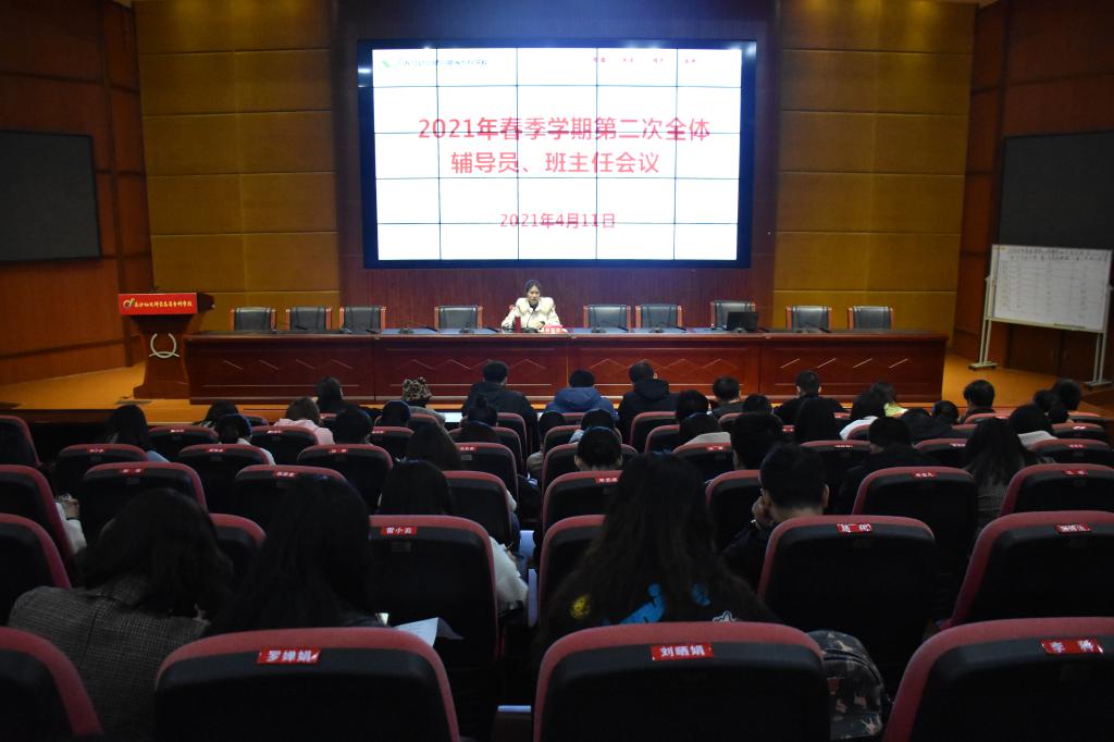 为促进学生管理与服务工作逐步迈上更高台阶,4月11日晚上19:00,2021年春季学期第二次全体辅导员、班主任工作会议在汇智厅召开,学工处处长彭繁珍、学工处副处长彭亮、学工处副处长兼团委副书记祝居里、各系德育副主任、德育干事、全体辅导员、班主任参加会议,大会由彭繁珍主持。