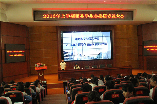 为了适应新学期要求,选拔出业务能强的新一批精英干部。 6月22日,湖南省宁乡师范学校2016年上学期团委学生会换届竞选大会在汇智厅隆重开展。本次换届竞选大会由国旗班班长王鑫主持,学生科科长周曦老师、学生科副科长彭繁珍老师、学生科副科长兼团委副书记王锐老师,学生科邹雯辉老师、银伶老师、戴申林老师、余金凡老师,班主任廖小勇老师、杨少武老师、朱萍老师及各班团支书和全体学生会干部参加。