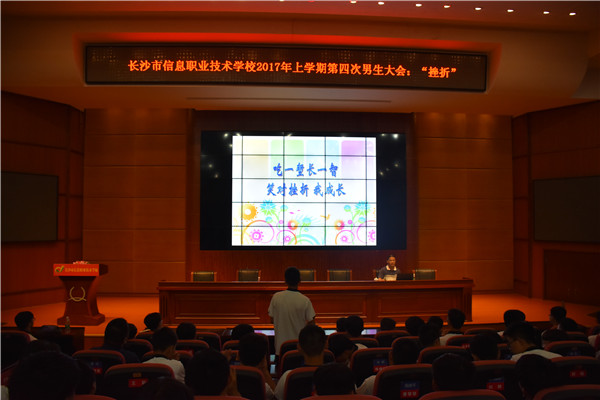 会议第三项,彭亮副科长讲话。首先,彭科长总结了宿舍管理常规与宿舍为人损坏物品赔偿情况。接下来,彭科长用一系列生动形象的故事告诉大家阳光总在风雨后,要学会笑傲挫折不断成长。最后,男生大会伴随着全体师生的诗朗诵《心存感激》落下帷幕。