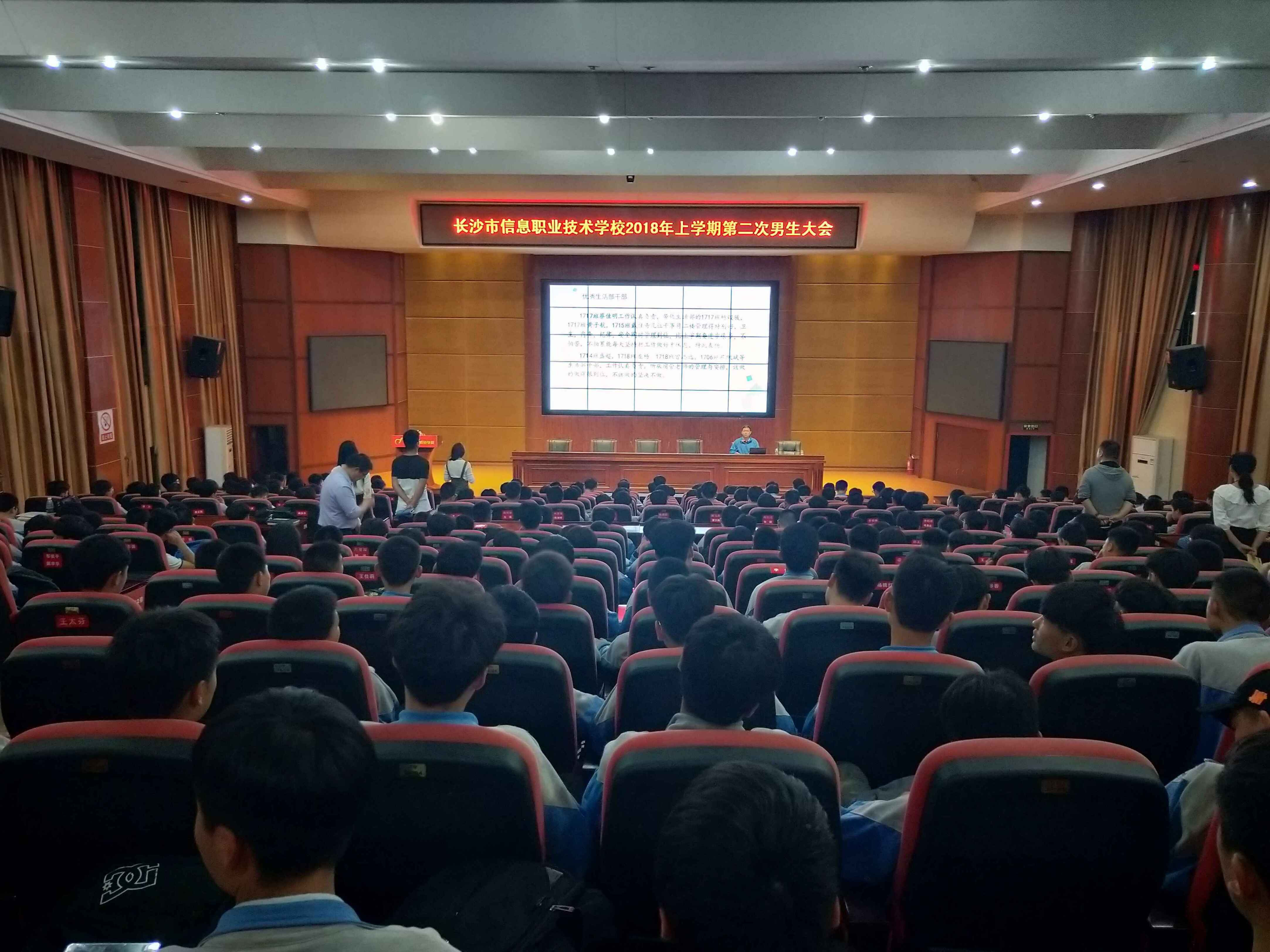 为了提高男生的安全防范意识和纪律意识,进一步加强寝室内务和卫生管理,2018年4月22日晚,长沙市信息职业技术学校全体男生在汇智厅参加2018年上学期第二次男生大会,全体男生班班主任及全体学生与会,大会由学生科副科长彭亮讲话。