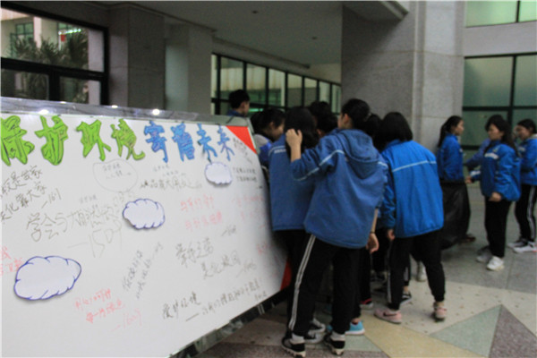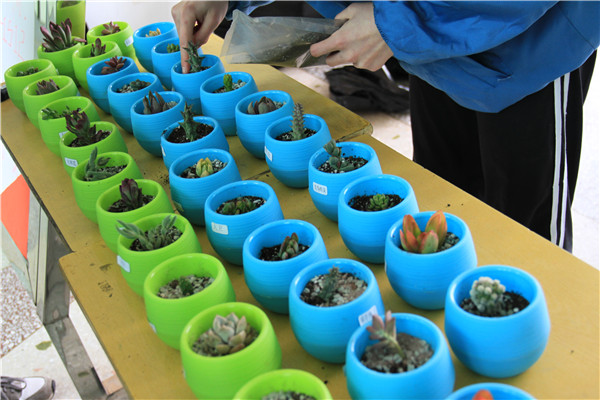 活动的主要内容是各班存集废水瓶来活动现场兑换绿色盆栽并由班级代表在寄语板上写下自己或班级保护环境的宣言。中午一点半活动还没开始,现场已经排起了长队。同学们表示:“每天班级扔的最多的就是喝完水后的矿泉水瓶,这下好了,把这些废品换成绿植,班级的读书环境更好了!”
