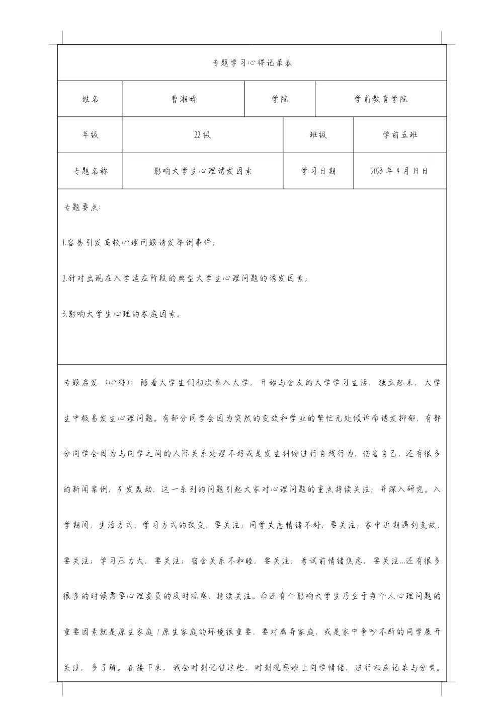 开展专题学习,普及知识,提升能力。为了提高辅导员对学生心理问题的识别和干预能力,心理发展指导中心特邀长沙理工大学心理健康教育中心专职教师、中国心理学会注册师易敏来校开展《大学生心理问题的识别与应对》专题讲座,指导我校心理专干及辅导员们精准、高效开展心理健康工作。此外,我校还派遣心理发展指导中心主任彭亮、心理发展指导中心专职教师彭申珍赴吉首大学、湖南应用技术学院交流学习,通过座谈交流、案例会诊、讲座培训等形式,进一步加强心理教育教学、心理咨询、危机防控等专业技能,为我校心理健康教育工作夯实基础。