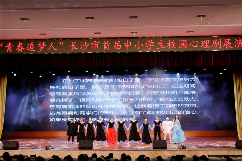 6月1日,长沙市首届中小学校园心理剧颁奖大会在长郡滨江中学拉开帷幕。出席本次大会的领导有湖南省教育科学学院心理专员彭玮婧、长沙市教育局学生工作处处长廖学文、长沙市教育科学学院院长孙智明等,各区县心理教研员、心理老师代表等也参与本次盛会。在欢快明朗的青春舞后,《谁打碎了玻璃》道出了调皮捣蛋的孩子想要妈妈的关注而故意犯错;《我要做哥哥了》结合二孩问题,讲述了孩子们的心声与成长心路;《梦青春》以多重梦境的方式,向全体同学共勉:青春需要奋斗才能无悔......我校《蜕变》作为压轴剧目,一出场便吸引住了全体与会人员的目光,1502班学生细致到位的表演让大家赞不绝口,现场掌声不断。梦想萌芽、奋力追梦、试图放弃、重拾信心、完美蜕变,一幕一幕层层递进,情节跌宕起伏,结合舞蹈班的实际情况,演出了心理剧的真正魅力。长沙市未成年人心理健康辅导中心主任梁珊说到:“你们的心理剧非常精致,打磨得非常好。”长沙市周南梅溪湖中心心理老师何园竹、刘芝玲说:“配音非常完美,没有一丝杂质;孩子们表演得也非常好,要向你们请教、学习。”