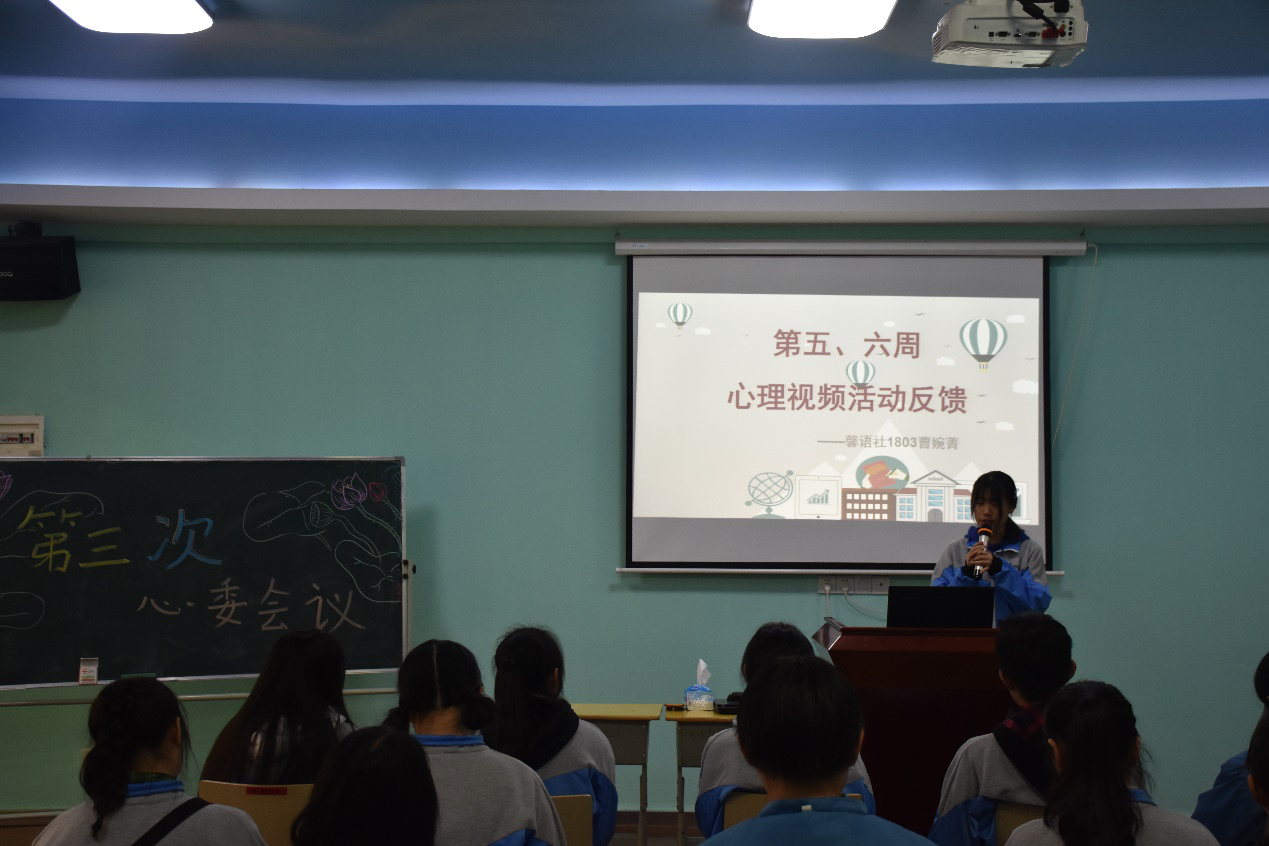 最后,曹婉菁总结了第4、5周心理视频宣传活动,大部分心委都积极组织了心理视频宣传活动,并引导学生思考视频内容,从中获得某方面的心理健康知识。
