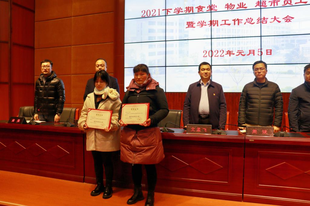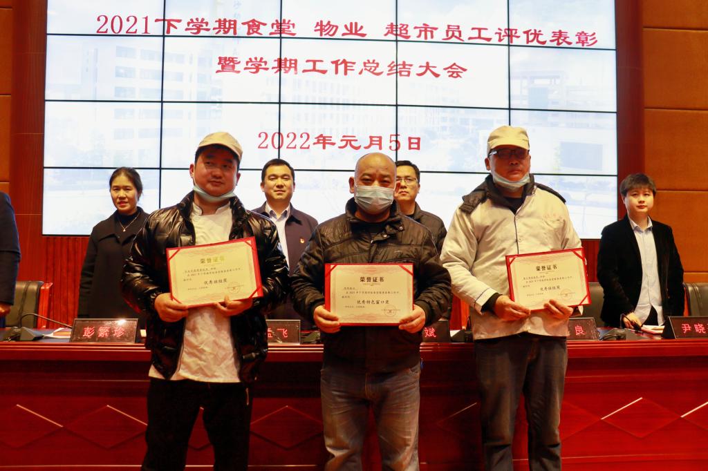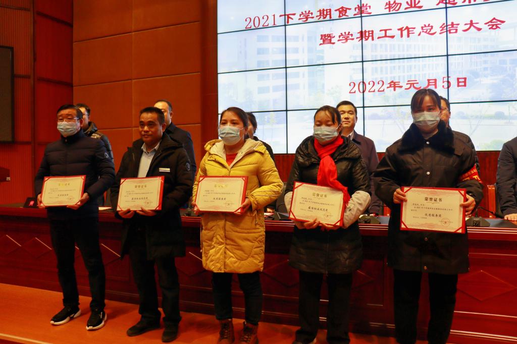 元月5日晚,我校在汇智厅召开2021年下学期食堂、物业、超市员工评优表彰暨学期工作总结大会。学校副校长文孟飞,后勤财务处处长周斌,学生工作处处长彭繁珍,后勤财务处副处长黄昊,学校食堂公司负责人郑良,学校物业公司负责人尹晓寻,学校超市负责人刘志恒,及食堂、物业、超市所有服务员工参加了本次大会,会议由黄昊主持。
