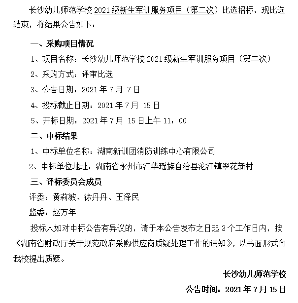 长沙幼儿师范学校2021级新生军训服务项目(第二次)比选中标公告