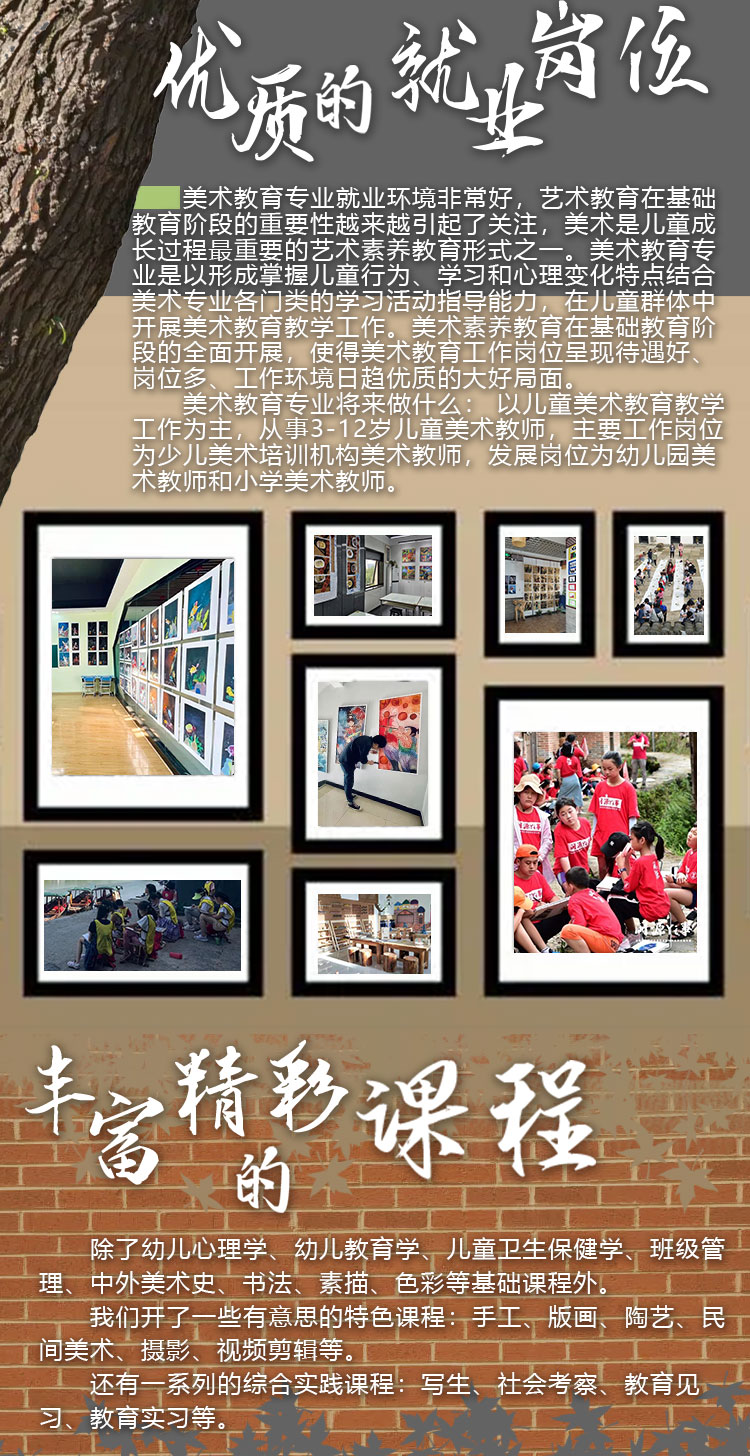■美术专业教师团队中有省美协会员、省青年美协理事、省油画学会理事、省视觉传达设计专业委员会委员、省实验艺术委员会委员、书法家协会会员、摄影家协会会员等16名。有13位教师举办过个人画展,多位教师或参加过国家级、省级重点展,或作品选录国家级核心书刊,近年专业教师获奖作品70多幅。