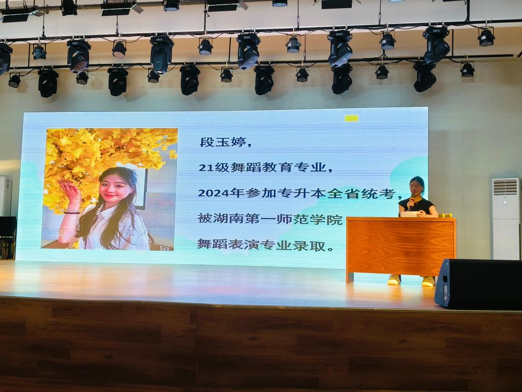 随后,四位成功升本的学姐——段玉婷、颜静、彭艺铭和王溢,分别上台分享了自己的专升本考试经验。段玉婷和颜静,两位舞蹈专业的优秀学生,成功考入湖南第一师范学院舞蹈表演专业。她们深入分享了备考过程中的心得和体会,特别强调了坚持练习和深入理解舞蹈内涵的重要性,并传授了应对考试压力和调整心态的宝贵经验。