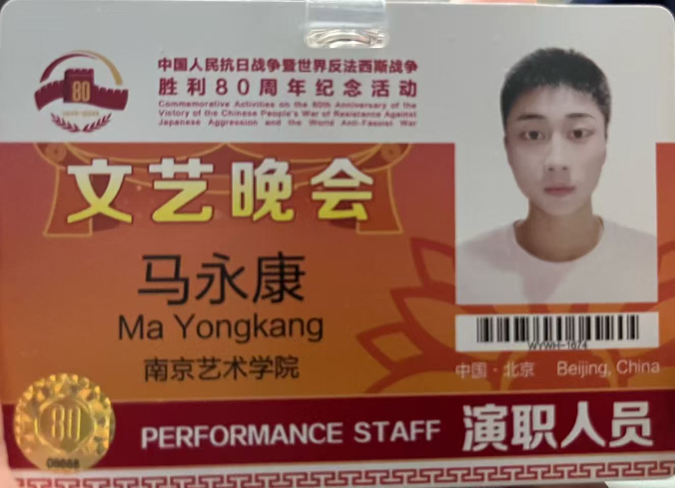 2025年9月3日,纪念中国人民抗日战争暨世界反法西斯战争胜利80周年文艺晚会《正义必胜》在北京人民大会堂隆重举行。我校艺术学院舞蹈表演专业2022届毕业生马永康、2024届毕业生黄甄,分别参演《延安!延安!》《势不可挡》节目。他们用充满力量的肢体语言深情诠释抗战精神,每一个动作都凝聚着对历史的敬仰。