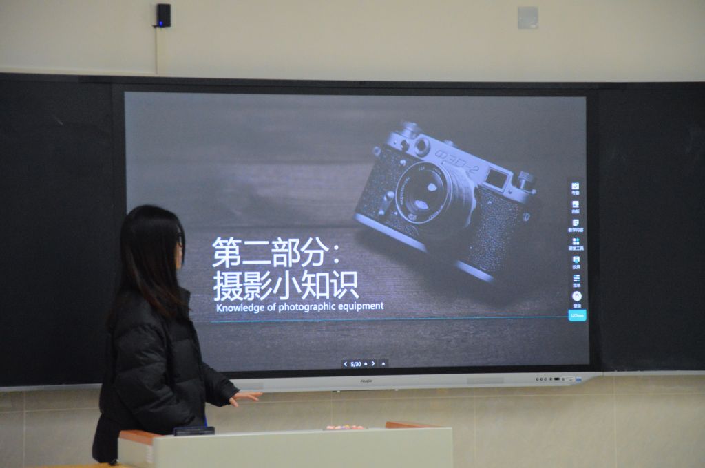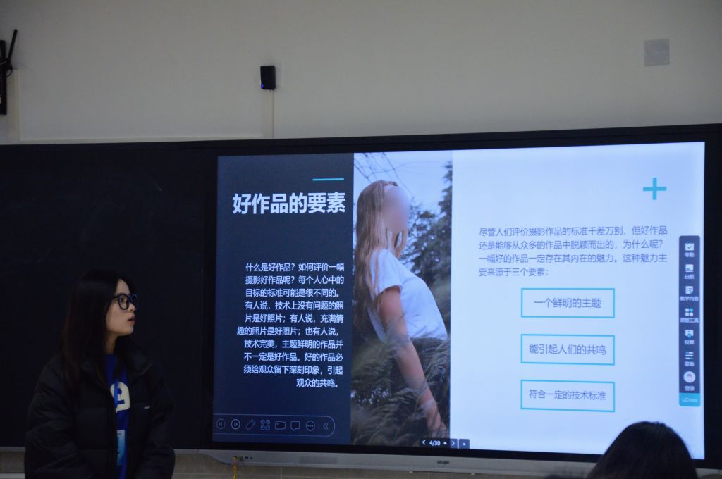 随后,摄影部部长胡嘉欣介绍了新闻稿图片的拍摄方式和格式要求,她提到,“一张好的图片的呈现,离不开对工具的灵活运用。”通过图片的对比,生动具体地分析相机的特性及性能。也描述了各种构图法,为同学们提供更好的灵感,同时工具不仅仅只是相机等设备,还需要学习后期美化,将图片进行精修调色,更完美的呈现。