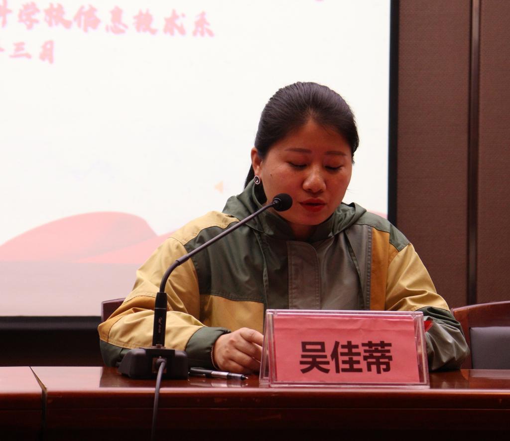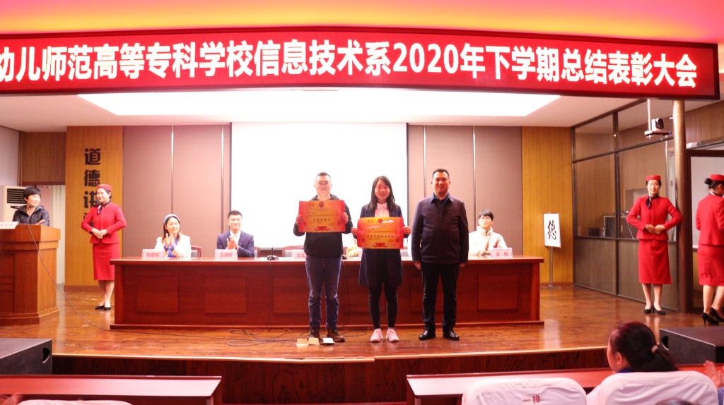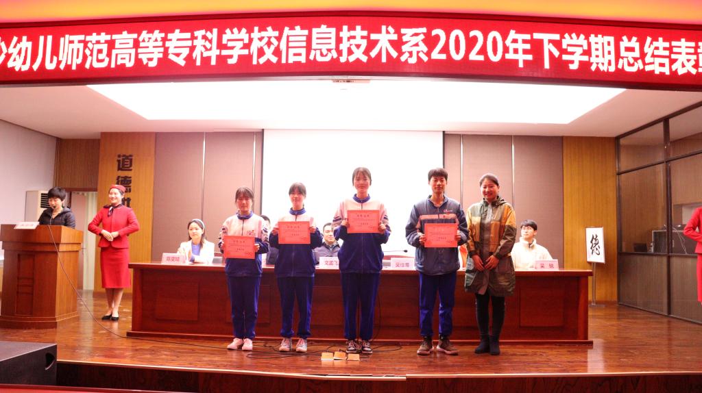 会议第三个议程:由信息技术系主任吴佳蒂宣读“信息技术系2020年下学期对优秀集体和优秀个人”的表彰决定。会议第四个议程:为获得优秀集体的班级和优秀个人的班级进行颁奖。第五个议程:学生代表发言,谢冰冰同学强调,在学习中要做到扎实肯干、尽职尽责;踏实勤奋、永不言弃;自信自强、挑战自我。
