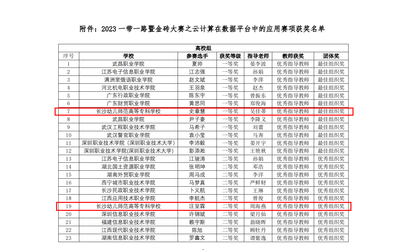 11月12日,一带一路暨金砖国家技能发展与技术创新大赛--云计算在数据平台中的应用赛项,于武昌职业学院赛区顺利落下帷幕。全国共有121支代表对队伍报名参与,包括深圳职业技术学院、湖南外贸职业学院、长沙民政职业技术学院等。经过多轮激烈比拼,最终,我院学生史章慧荣获高校组一等奖、指导老师吴佳蒂荣获优秀指导教师和最佳组织奖;学生汪呈霖荣获高校组二等奖,指导老师周海燕荣获优秀指导教师和优秀组织奖。
