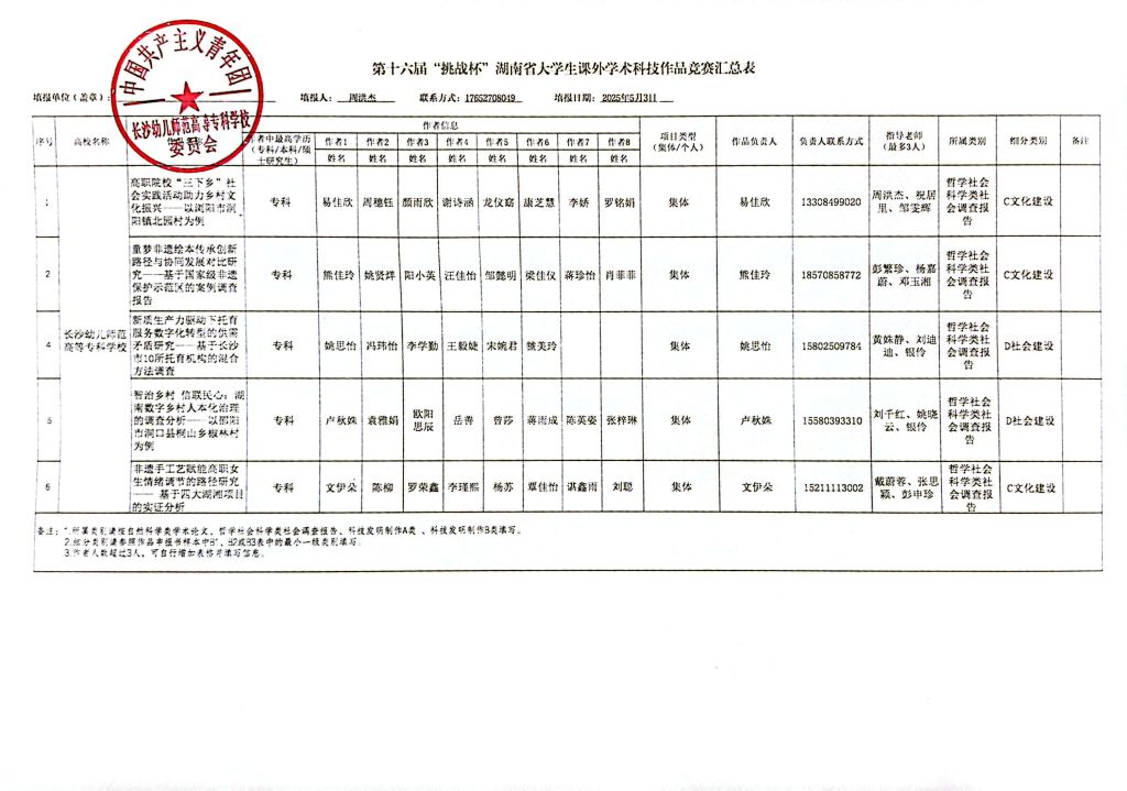 根据《关于组织开展第十六届“挑战杯”湖南省大学生课外学术科技作品竞赛的校赛通知》文件要求,经个人报送、学院推荐、专家评审等环节,学校共推选出5个项目团队参加省赛,现将推选结果予以公示,公示期:2025年5月3日-2025年5月7日,公示期如有异议,可通过书面形式或电话形式反应至评委会,联系电话:0731-85649938。