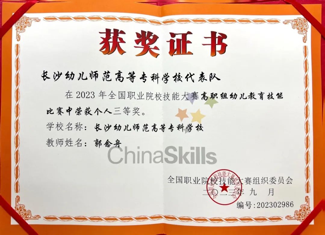 在9月3日结束的2023年“中银杯”全国职业院校技能大赛高职组幼儿教育技能赛项(教师赛)中,betway网站学前教育学院郭念舟老师代表我校参加该比赛项目,荣获个人三等奖。