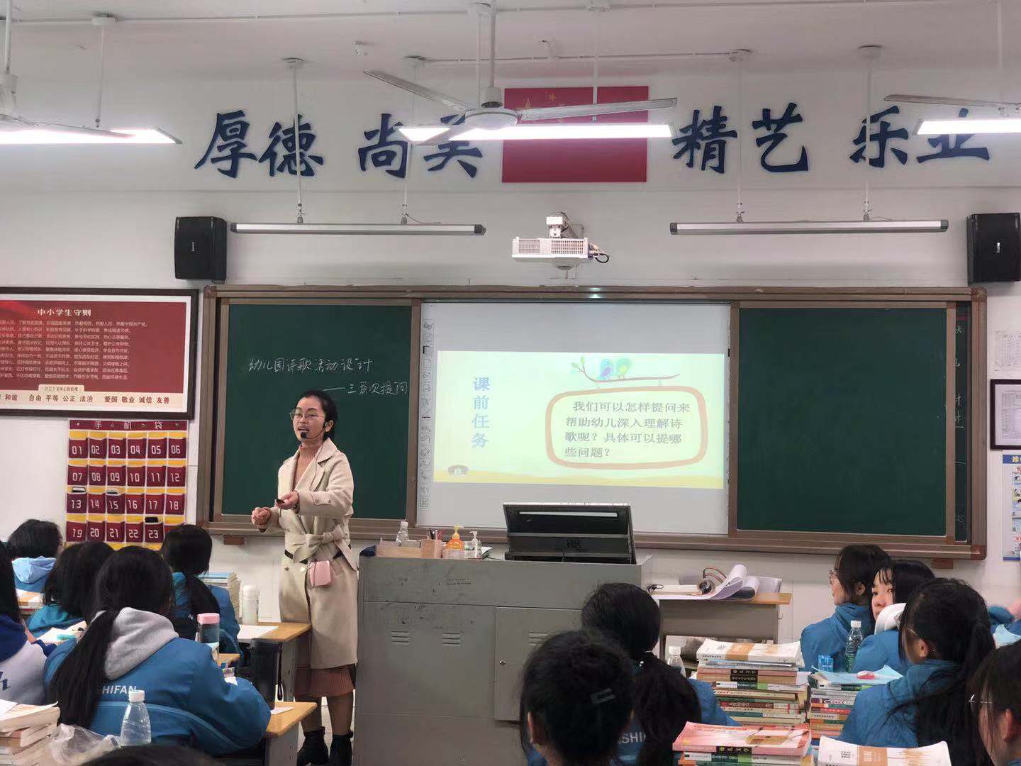 12月25日,熊芳老师在1904班进行了以《幼儿园诗歌活动设计中的三层次提问》为主题的汇报课。熊老师选用优美的诗歌《落叶》作为教学素材,通过创设参与式课堂,将知识传授、能力培养、职业素养引导相结合,运用小组讨论、情境模拟等多种教学方法,深入浅出地让学生了解幼儿园诗歌活动设计中的三层次提问。