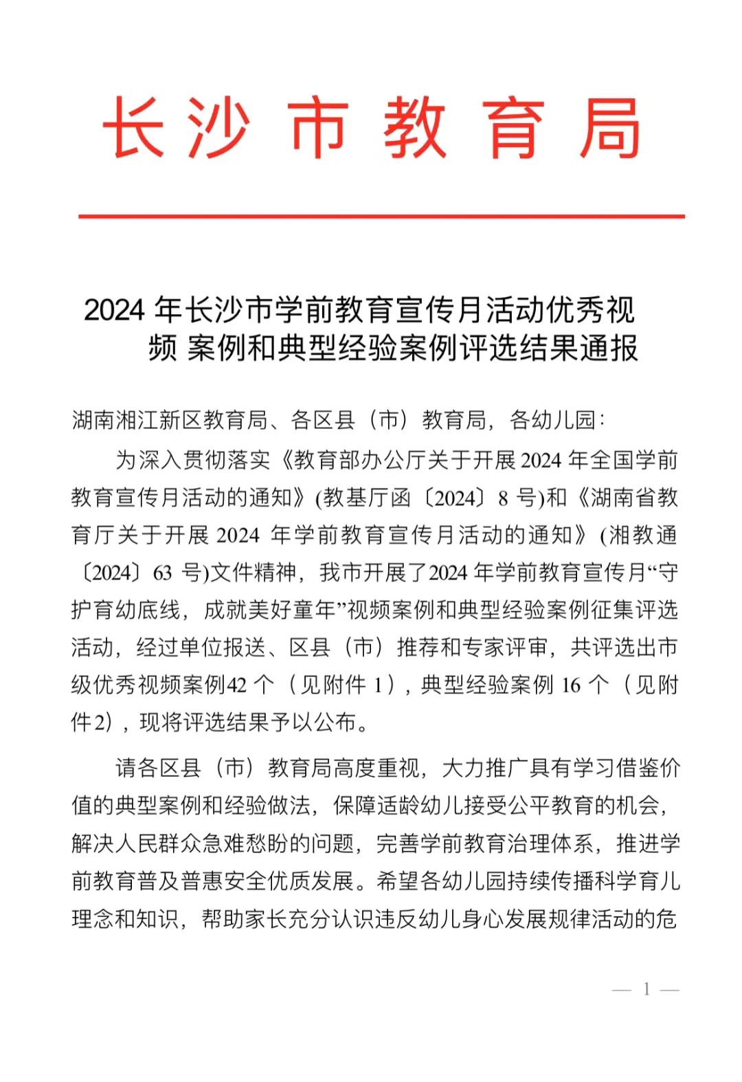 恭喜我园视频案例《向美的班级生活——我的“向美而育”故事》在2024年长沙市学前教育宣传月活动优秀视频案例和典型经验案例评选中获一等奖。