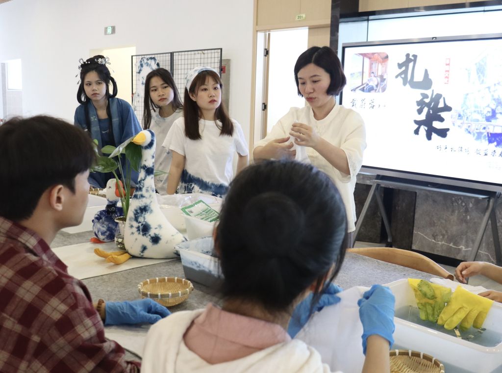 由非遗文化传承人及学校学前教育学院“融传”非遗美育工作室的专业师生带来的编织、剪纸、扎染、糖画、插花、制香、盘扣、茶艺等