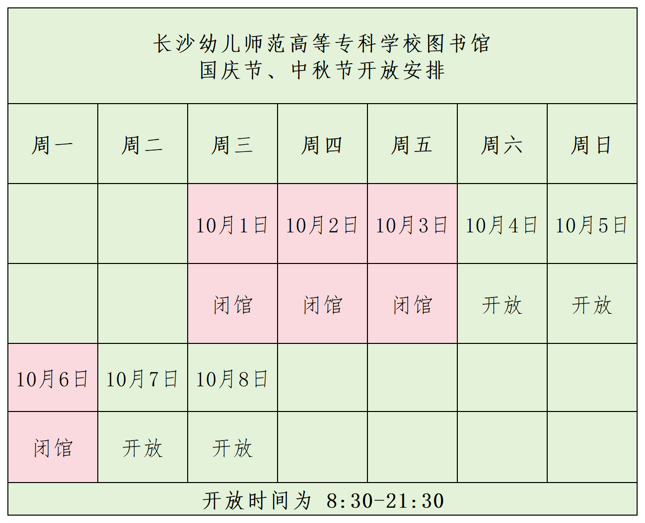 根据国家放假规定,图书馆国庆节、中秋节期间开放时间调整如下,请老师和同学们合理安排时间。国庆、中秋假期间欢迎来图书馆阅读、休闲和自习。