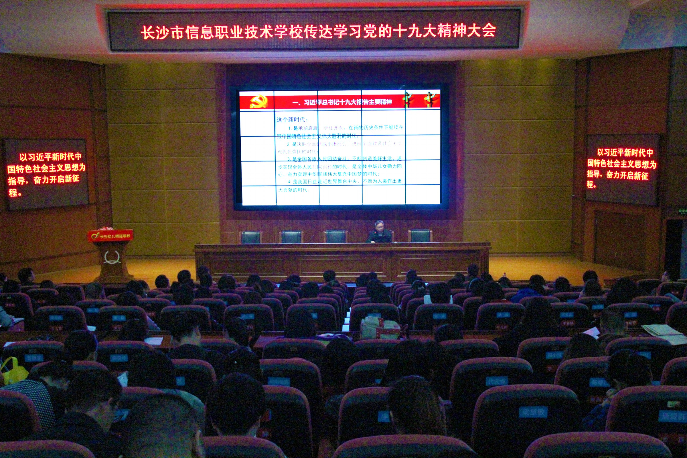 最后,郭正良强调,全校教职员工要深入学习领会十九大精神,坚决贯彻习近平总书记提出的新思想,围绕学校升格建设长沙幼儿师范高专的重要目标,借助十九大的东风,勇于探索、积极作为,为学校的跨越式发展做出应有的贡献。
