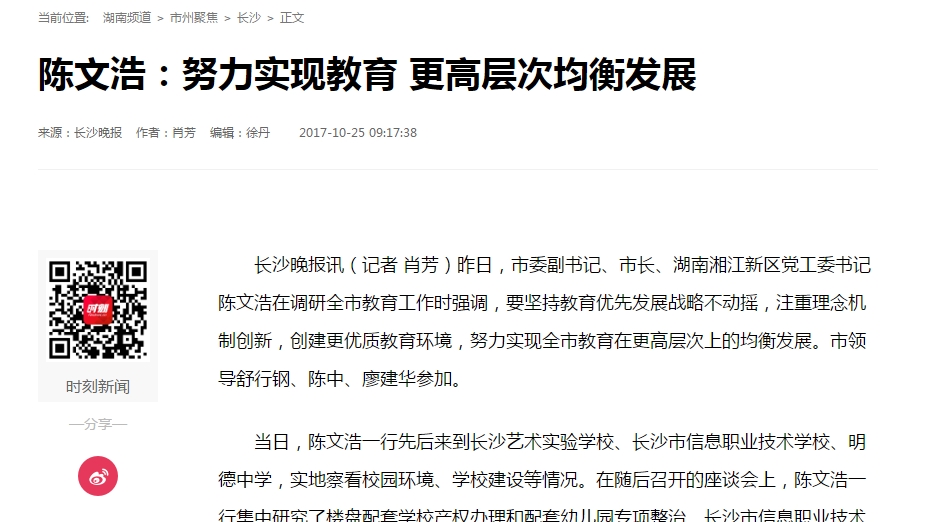 长沙晚报讯(记者 肖芳)昨日,市委副书记、市长、湖南湘江新区党工委书记陈文浩在调研全市教育工作时强调,要坚持教育优先发展战略不动摇,注重理念机制创新,创建更优质教育环境,努力实现全市教育在更高层次上的均衡发展。市领导舒行钢、陈中、廖建华参加。