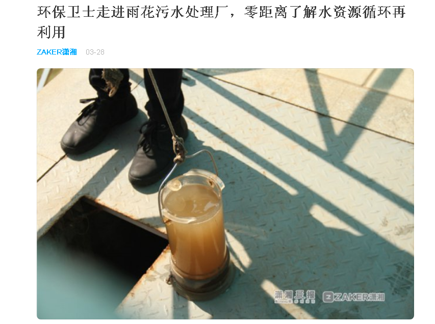 3月27日上午,正值长沙水业集团举行 " 世界水日 · 中国水周 " 系列活动——污水处理厂开放日,雨花区同升街道组织辖区的环保卫士们走进雨花污水处理厂,见证了污水经过一道道 " 工序 " 最终变清的过程。